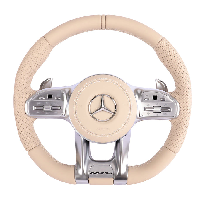 This Mercedes Benz white semi-perforated silver button paddle steering wheel is designed to enhance your driving experience. The lightweight design, ergonomic construction and silver button paddles provide a direct and comfortable feel, making it the ideal steering wheel for any Mercedes Benz model.